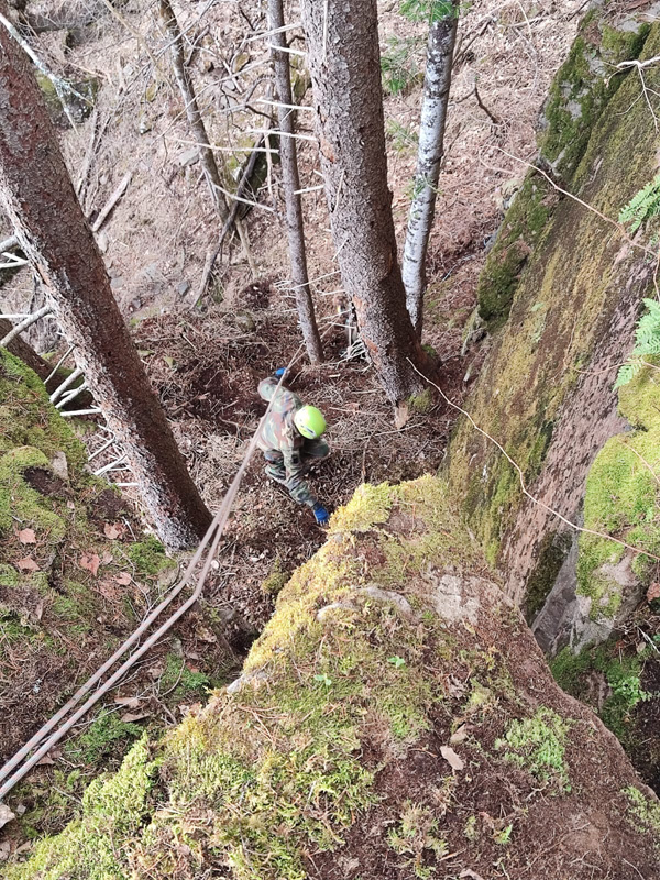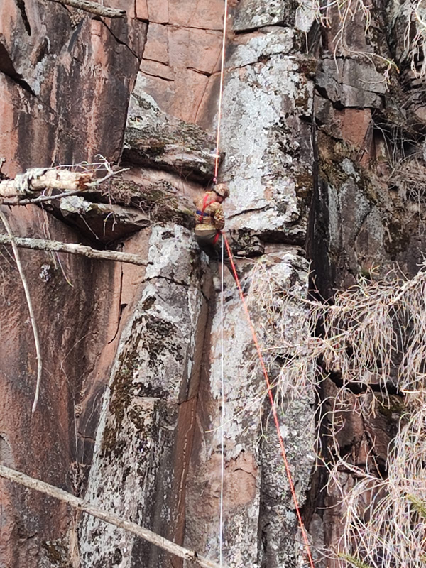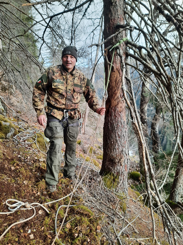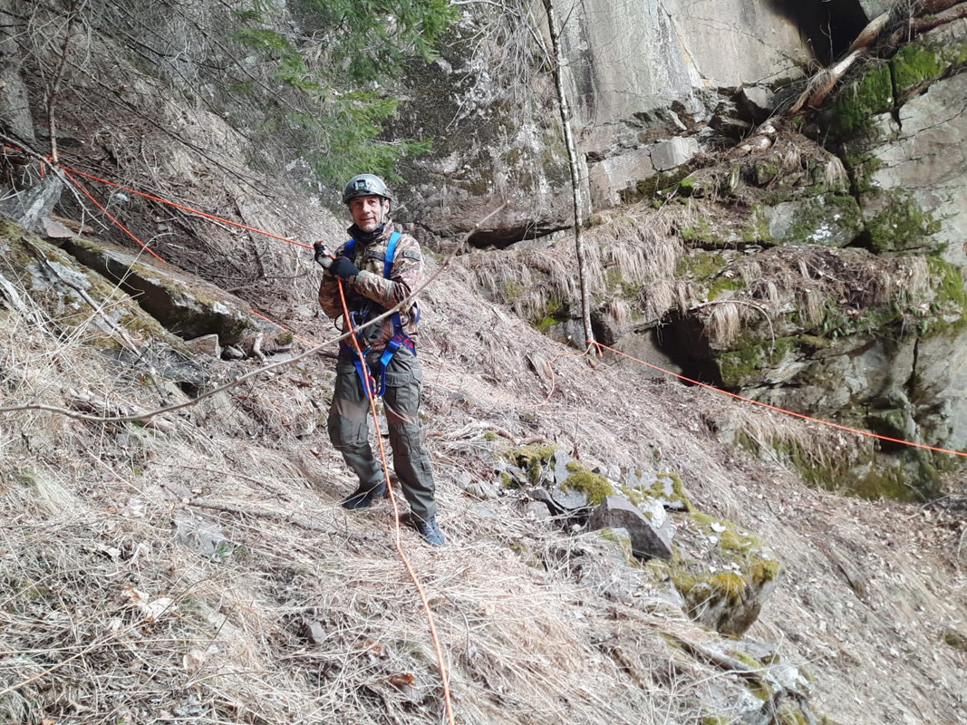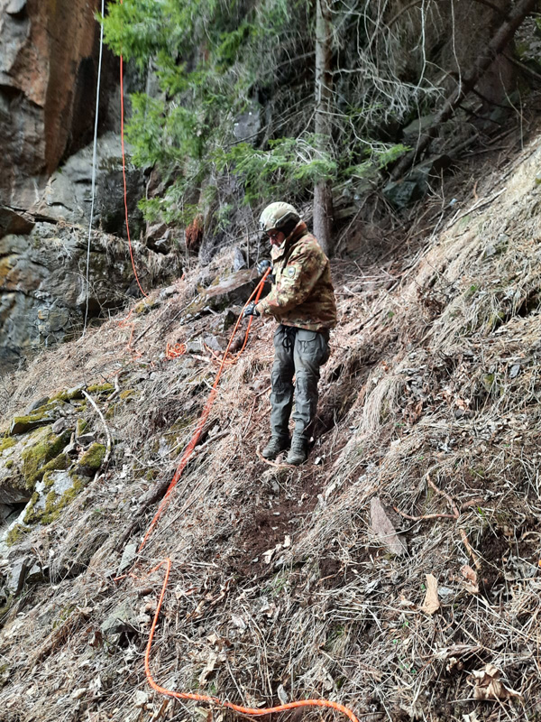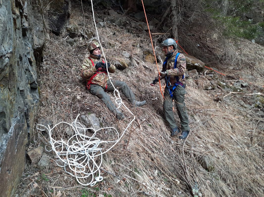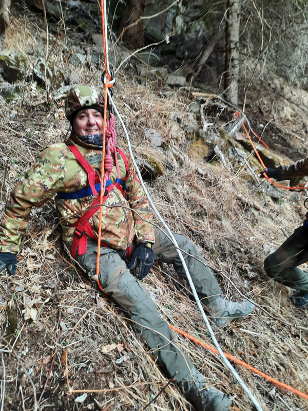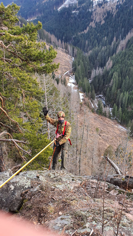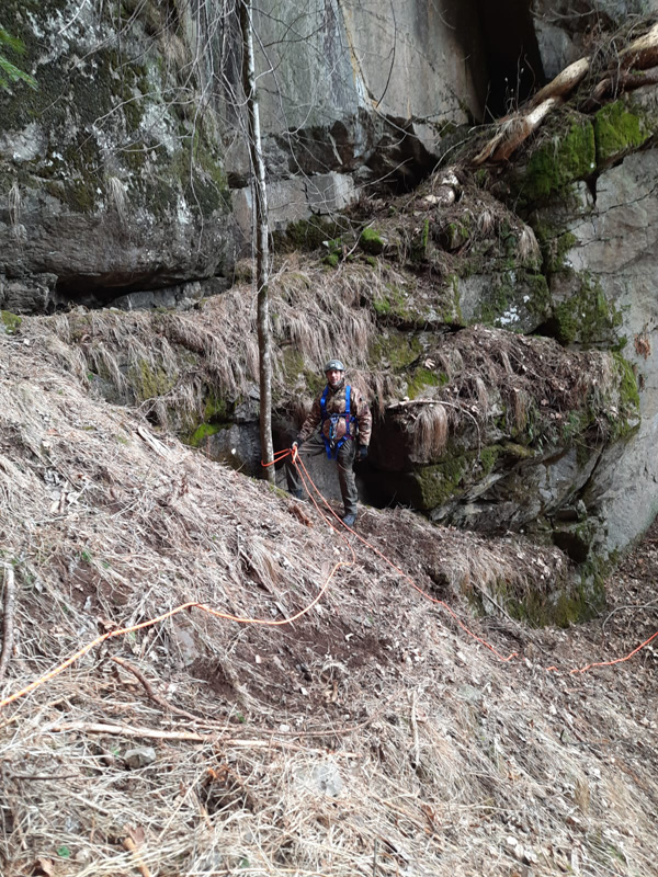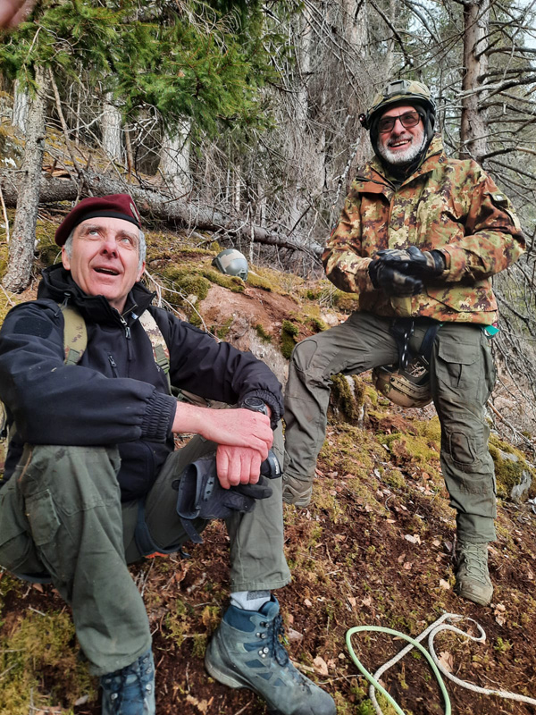 Dopo l’avvicinamento nel bosco per raggiungere la posizione del belvedere e assicurate le corde per la calata in corda doppia, ma soprattutto aver consolidato le scalette improvvisate con corde per superare la parete per il rientro, si cominciava l’attività la discesa.