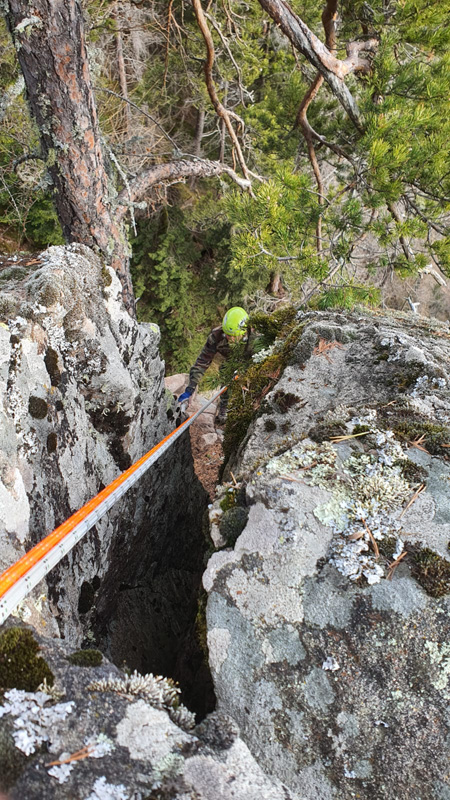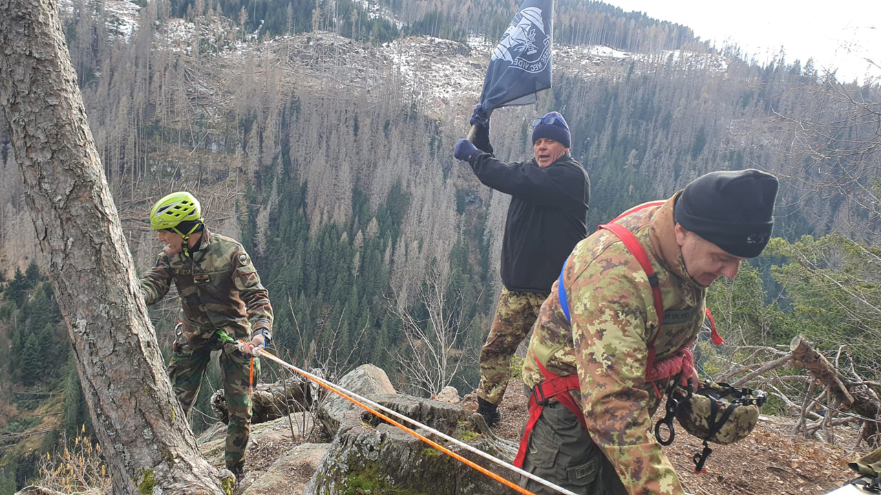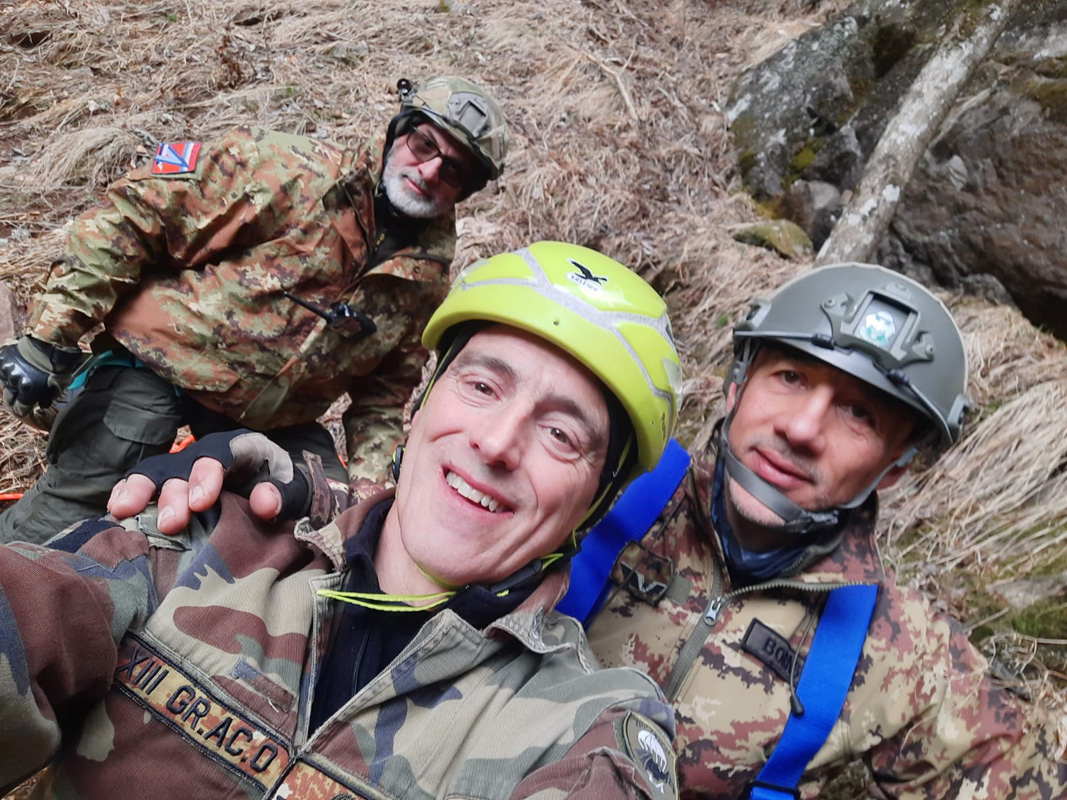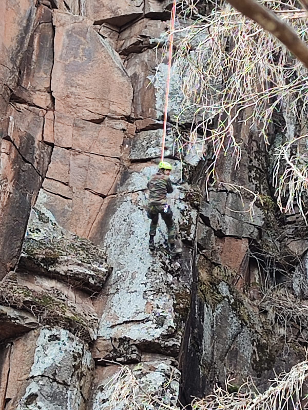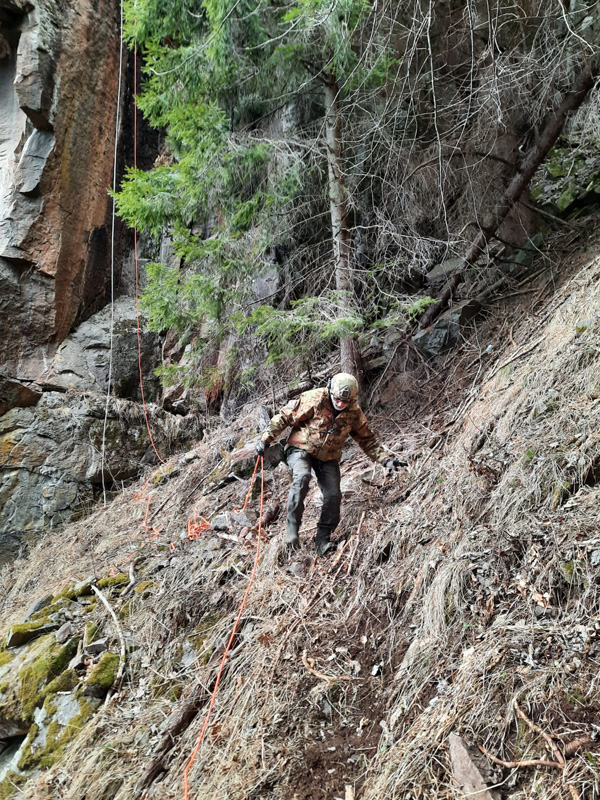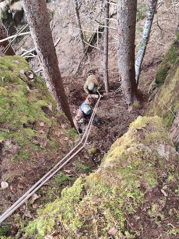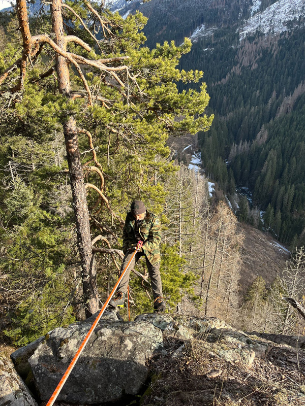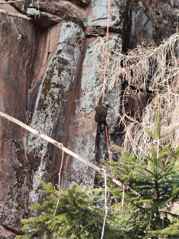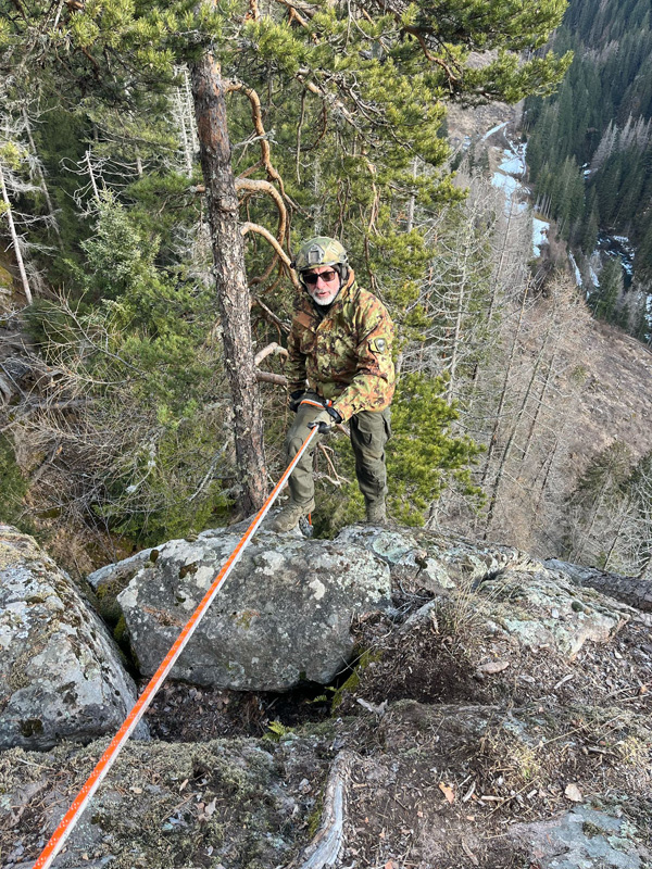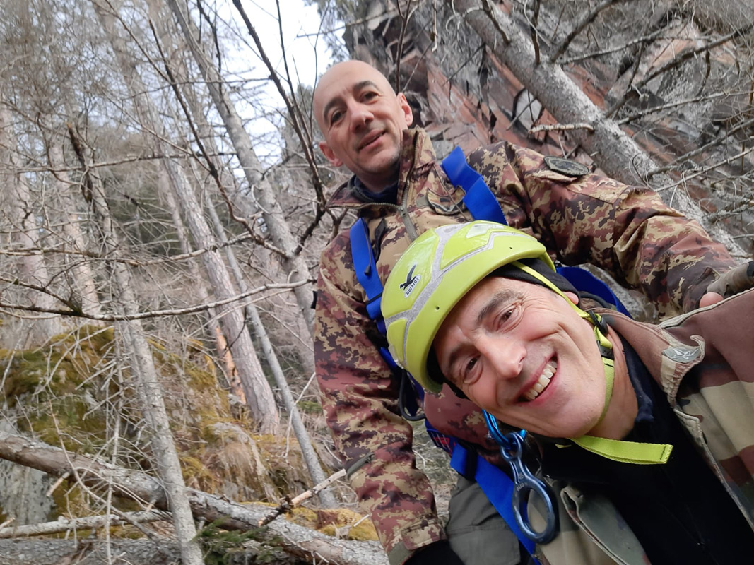 Dopo l’avvicinamento nel bosco per raggiungere la posizione del belvedere e assicurate le corde per la calata in corda doppia, ma soprattutto aver consolidato le scalette improvvisate con corde per superare la parete per il rientro, si cominciava l’attività la discesa.