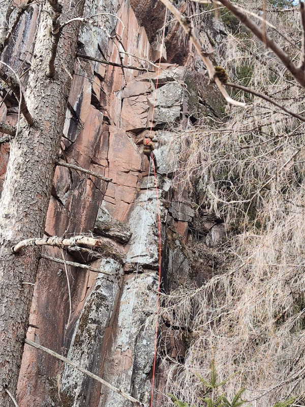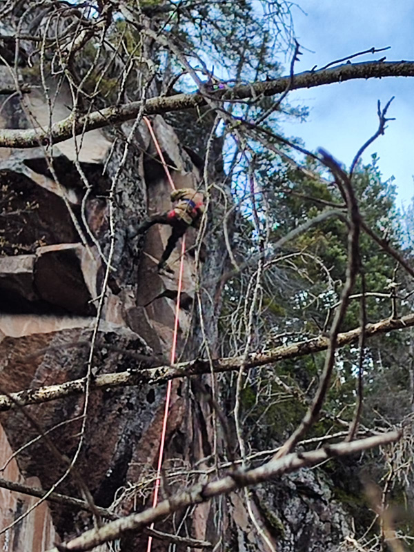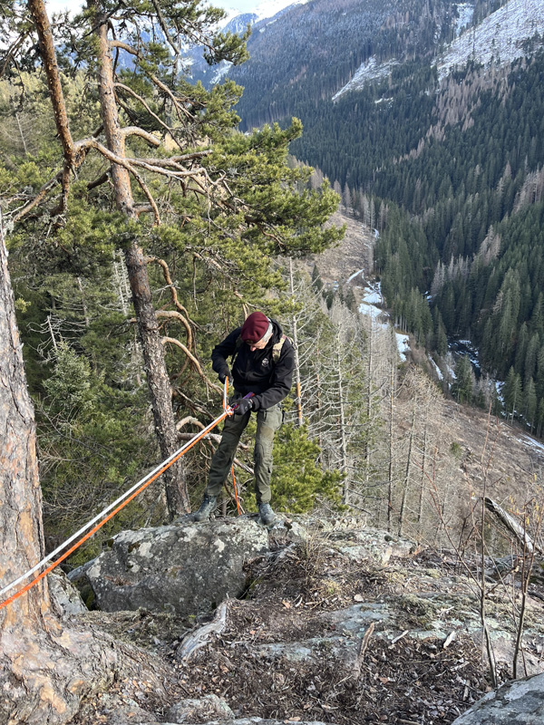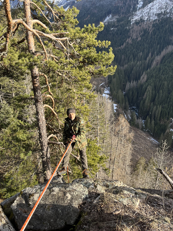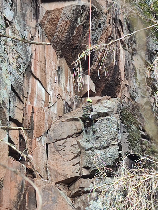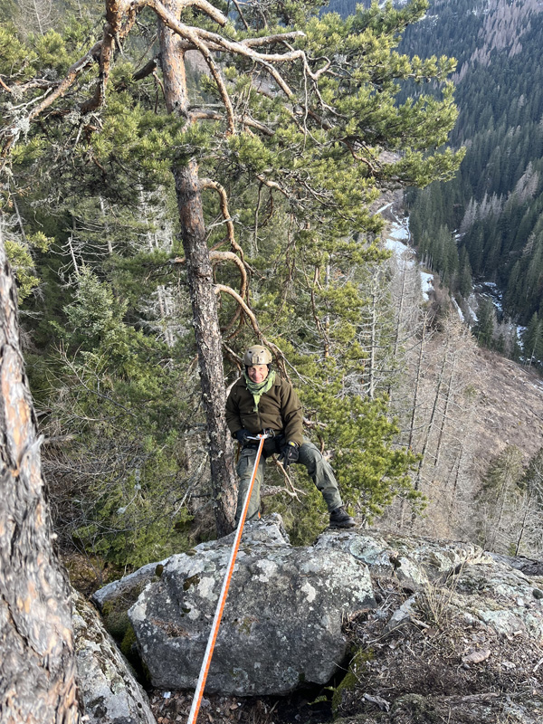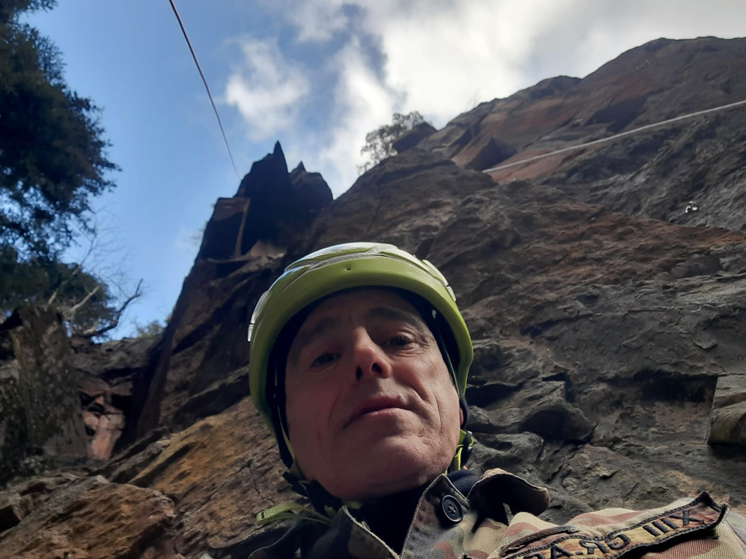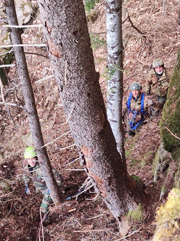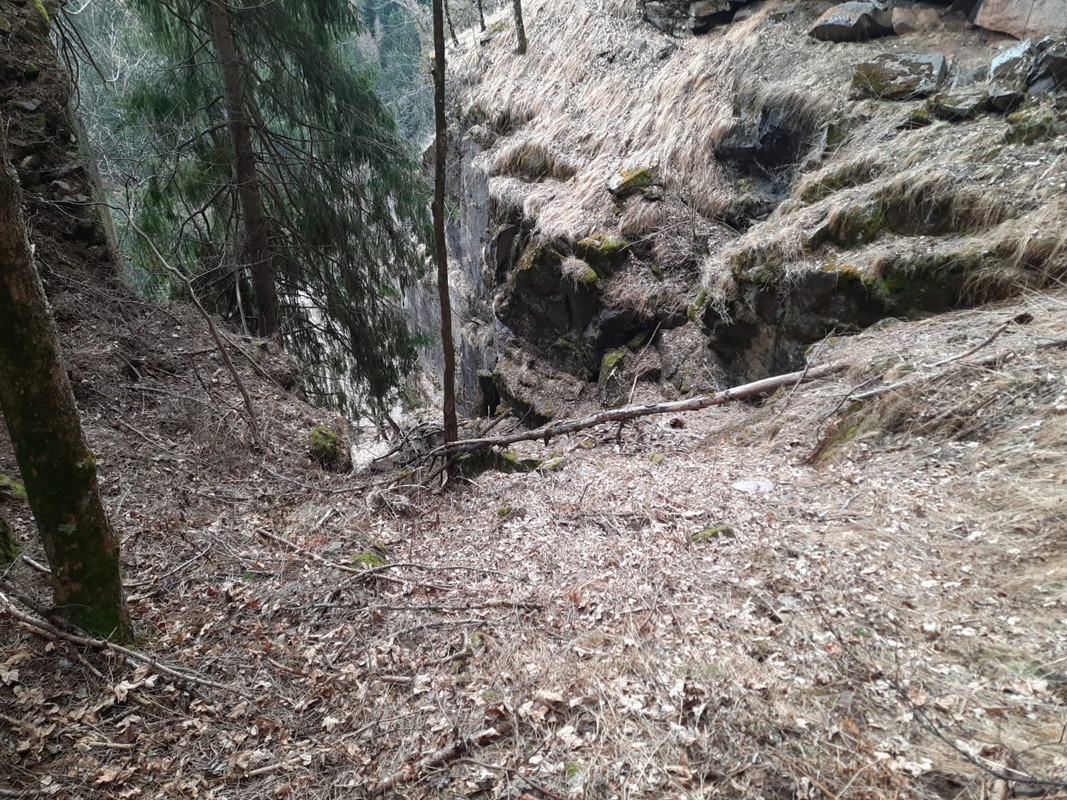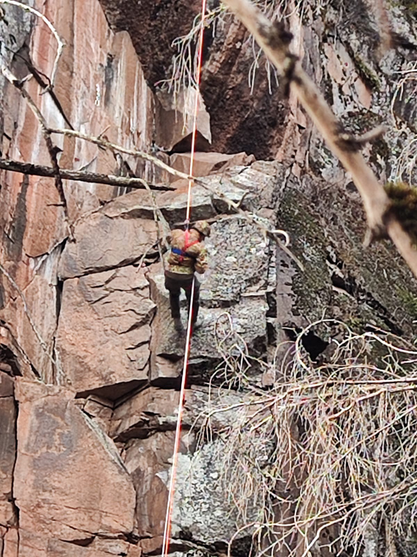 Dopo l’avvicinamento nel bosco per raggiungere la posizione del belvedere e assicurate le corde per la calata in corda doppia, ma soprattutto aver consolidato le scalette improvvisate con corde per superare la parete per il rientro, si cominciava l’attività la discesa.