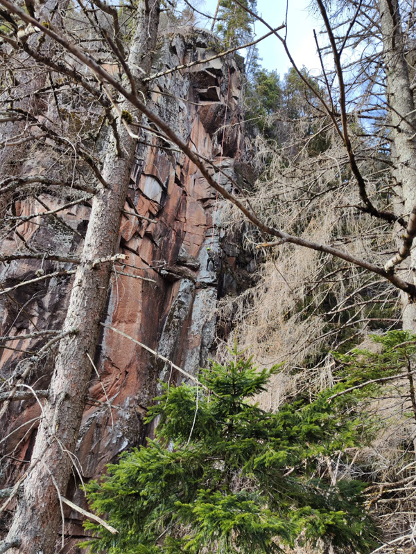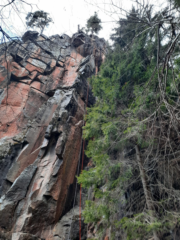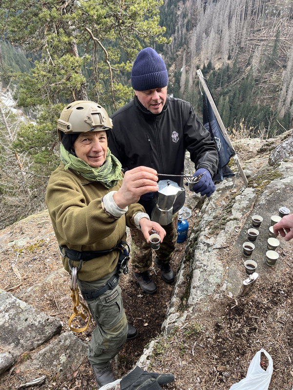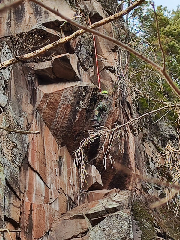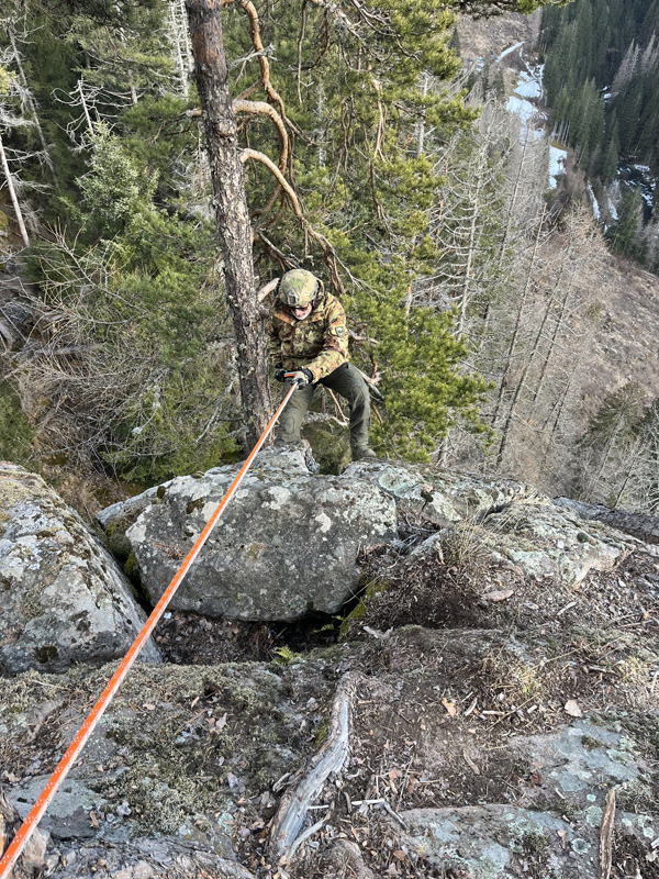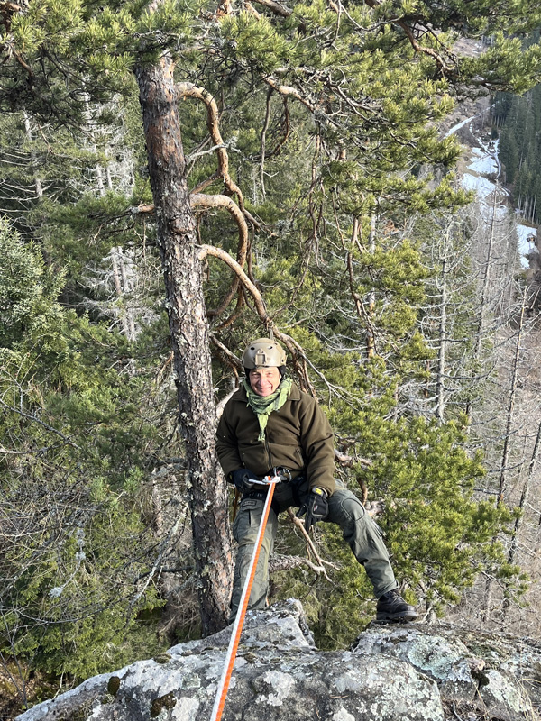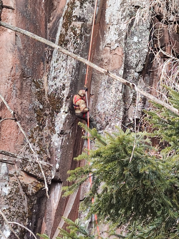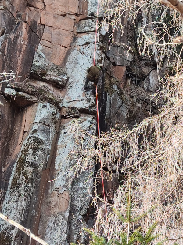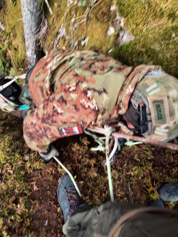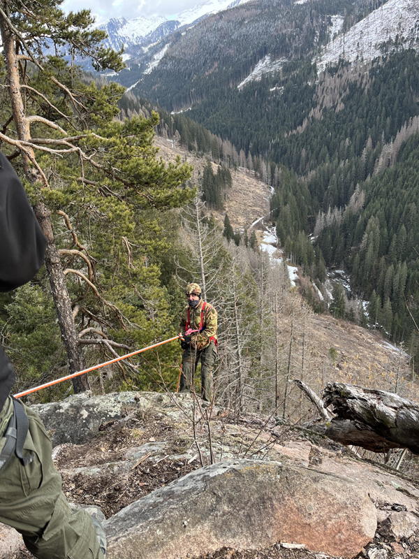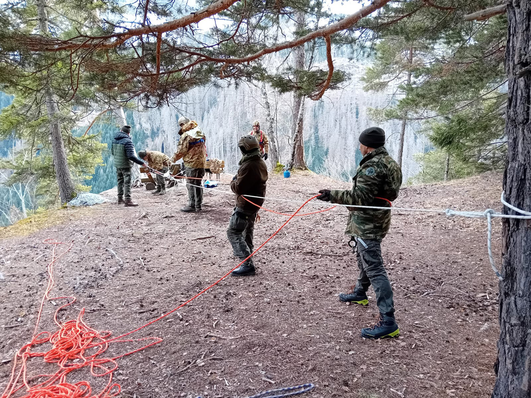 Dopo l’avvicinamento nel bosco per raggiungere la posizione del belvedere e assicurate le corde per la calata in corda doppia, ma soprattutto aver consolidato le scalette improvvisate con corde per superare la parete per il rientro, si cominciava l’attività la discesa.